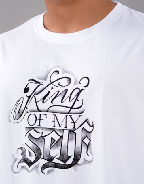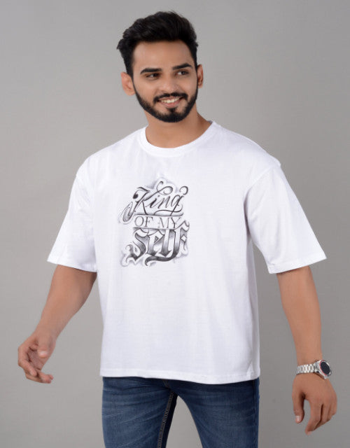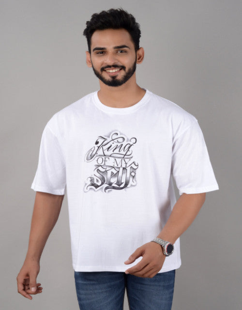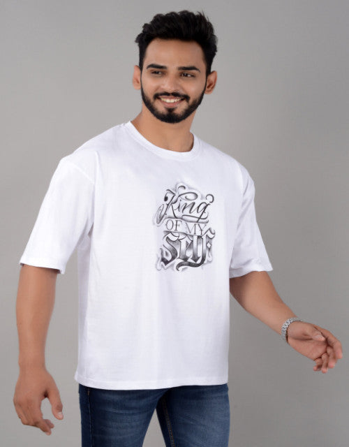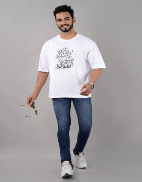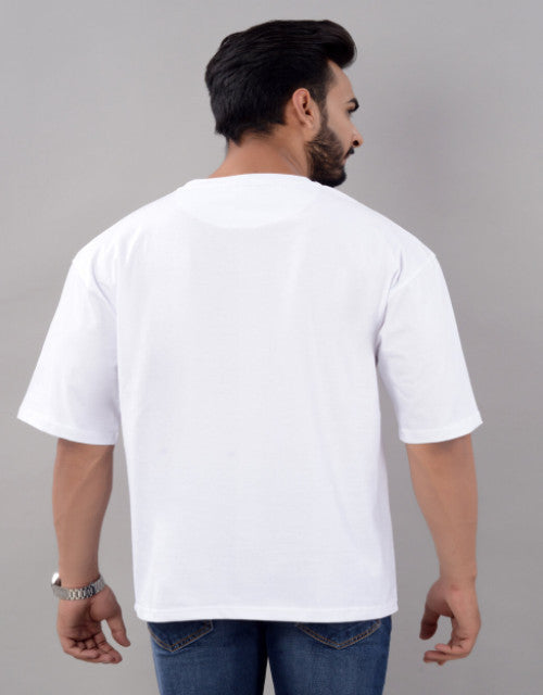 Cotton Blend Oversize Loose Fit Drop Shoulder Round Neck Half Sleeve Graphic Printed White T-Shirt for Men (SIZE- M,L,XL,XXL)